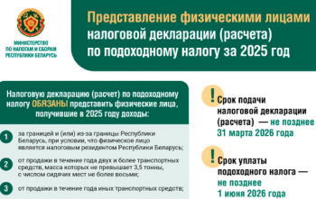 Министерством по налогам и сборам в рамках проводимой кампании по информированию физических лиц, имеющих обязанность по предоставлению налоговой декларации (расчета) по подоходному налогу за 2025 год размещена инфографика с целью напоминания гражданам об необходимости предоставления физическими лицами налоговой декларации (расчета) по подоходному налогу за 2025 год.
